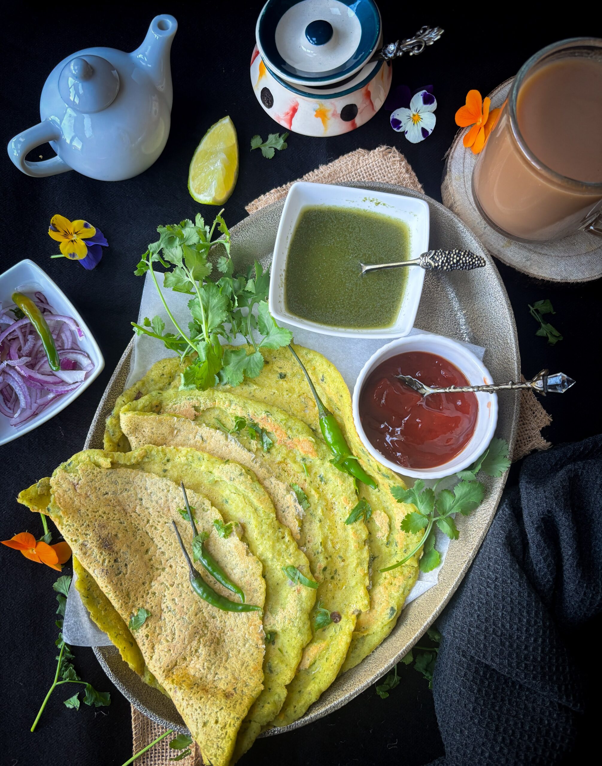 Chana Dal Cheela is a savory pancake made with soaked and ground chana dal with fresh coriander, ginger, chillies and onion for a bright and tasty flavor. Chana dal is naturally rich in plant based protein and fibre, which keeps you full for longer and gives you energy through out the day.