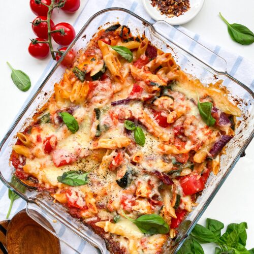 This Veggie Pasta bake is hearty, healthy and very flavorful pasta dish. It is packed with bright and colorful roasted vegetables and its great for crowds , easy to freeze and reheat . Peppers, courgette, and onions are tossed in olive oil and Italian seasoning and then baked in oven to bring out their intense flavors. Just add pasta and tomatoes and then top with mozzarella for a meal that is nutritious , delicious and super easy to make.